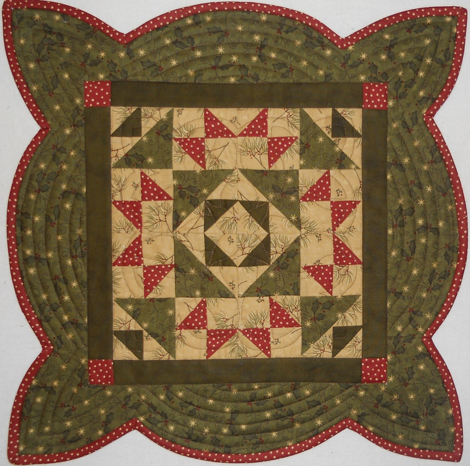 In this pattern I used the red for the dark & the large triangles the same as the border - the pretty green Christmas print - putting red cornerstones in the first border! That's what's fun with the Table Cozees patterns - you can move fabrics around, mediums & darks - & still have a great look! This pattern is actually just 4 blocks of Old Maid's Puzzle to make the center of the little quilt.
